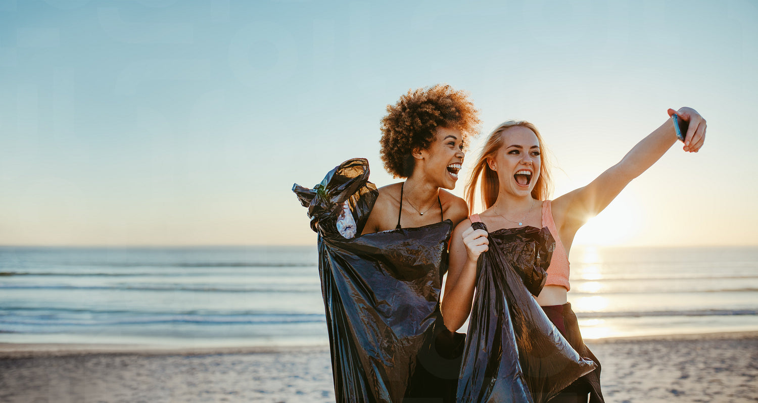 Female volunteers with garbage bag taking selfie on the beach after doing trash tag challenge.