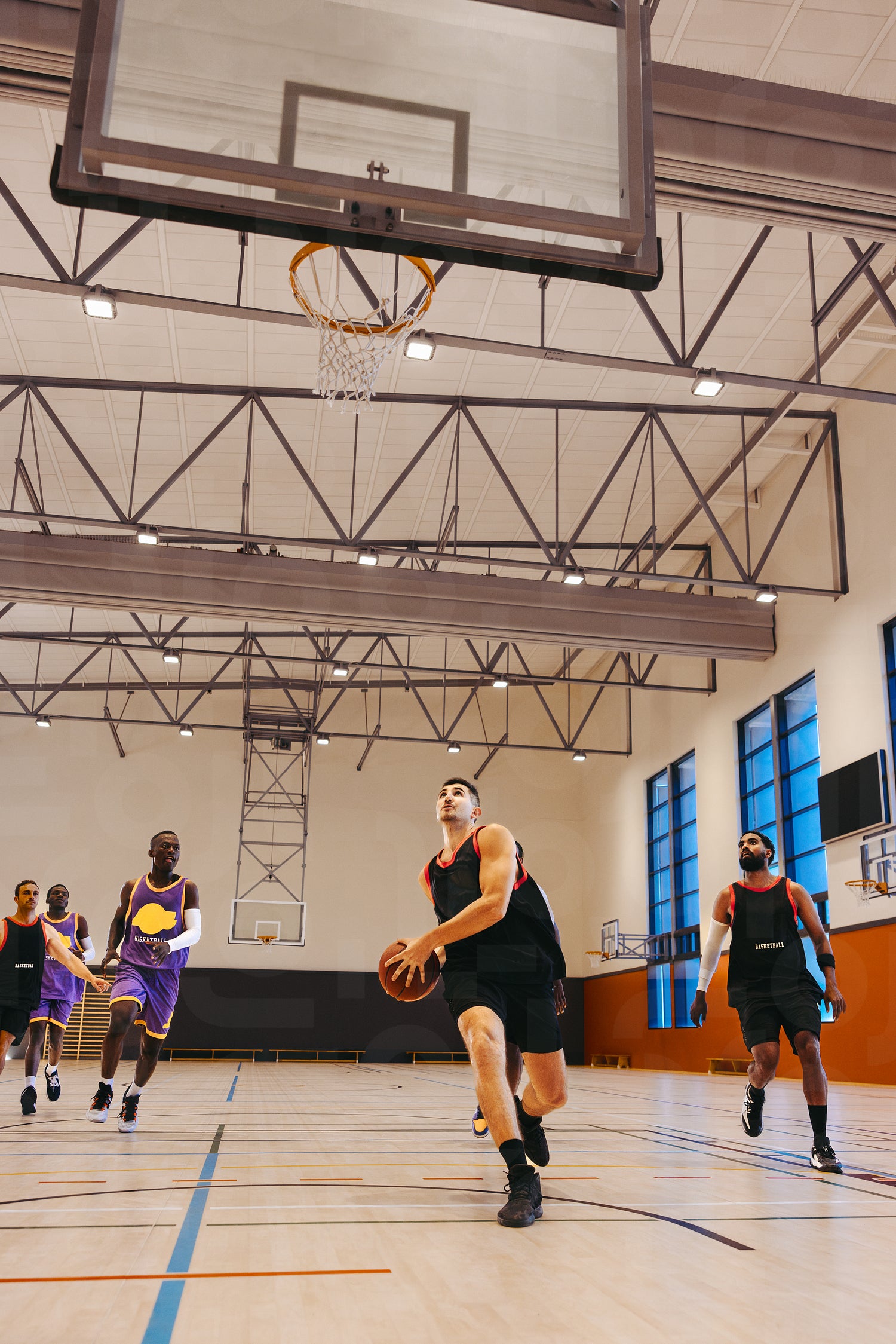 Athletes playing basketball indoors together