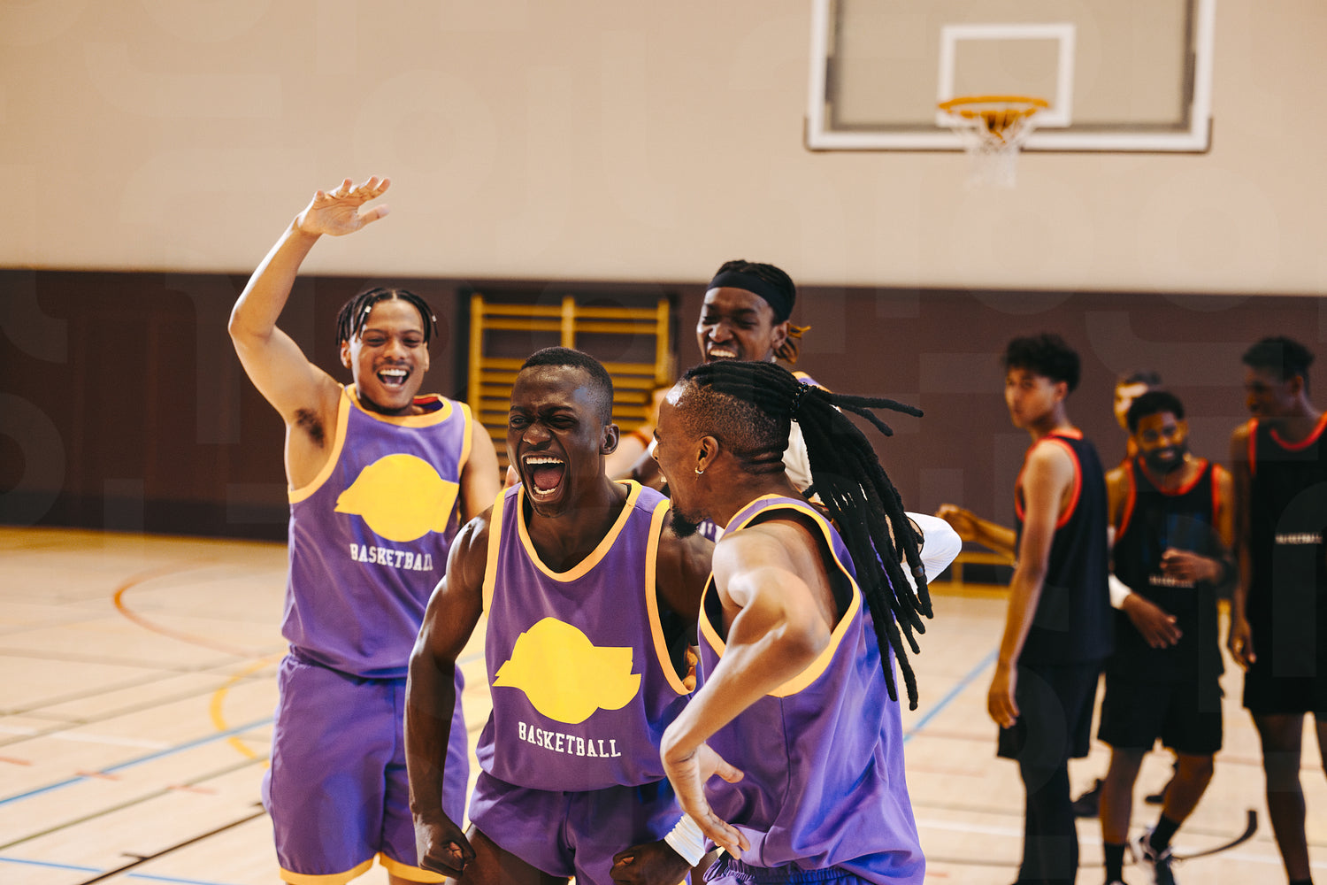 A group of basketball players in jerseys express excitement and joy after winning a match in an indoor court, showcasing sport teamwork, happiness, and shared celebration.
