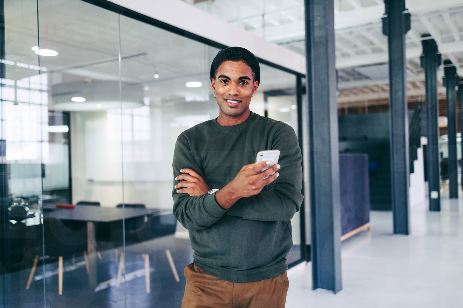 Creative young businessman holding a smartphone in a modern office. Happy young businessman looking at the camera while standing alone in a workplace. Young businessman sending a text message.