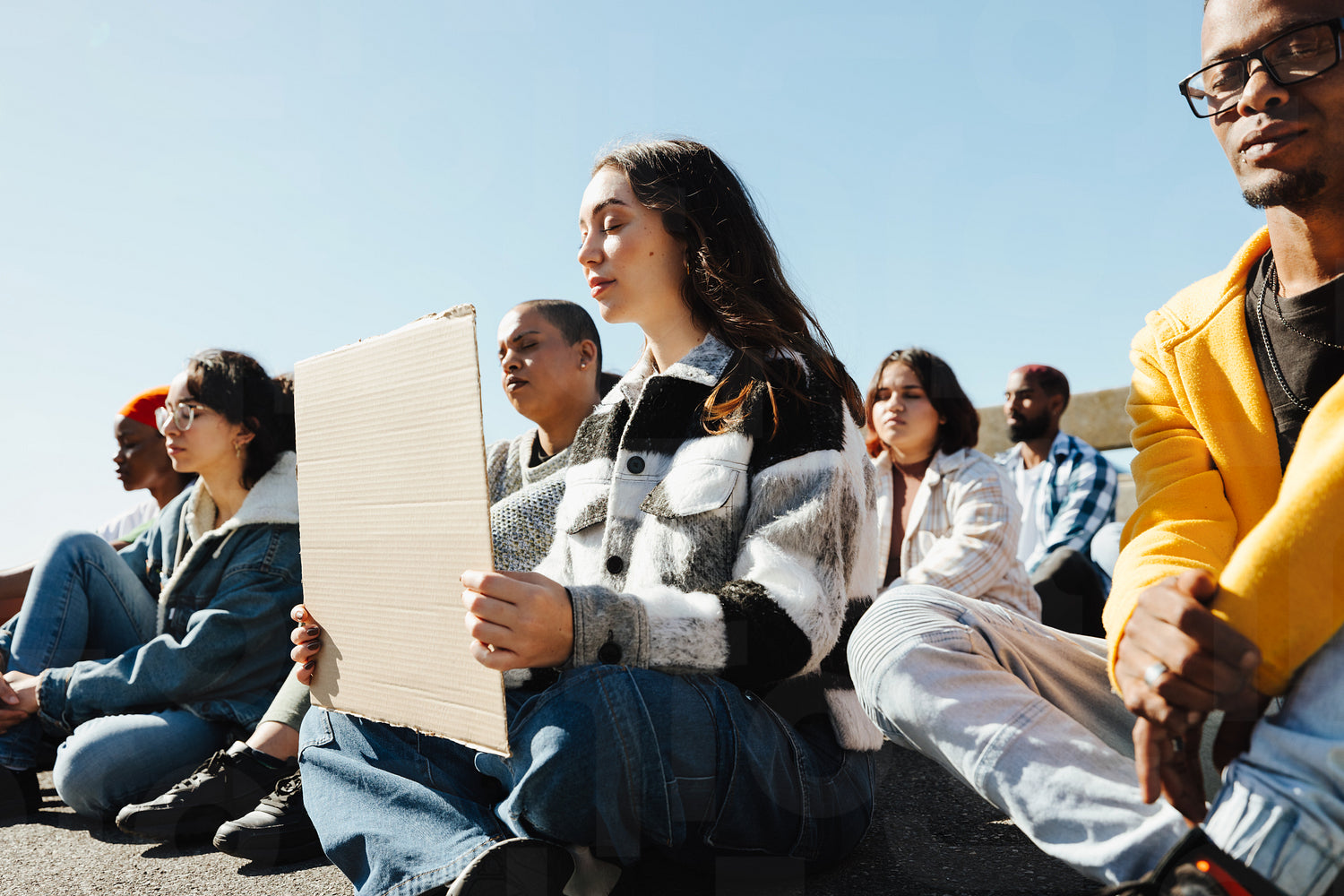 Group of protestors seated outdoors holding signs on a bright sunny day