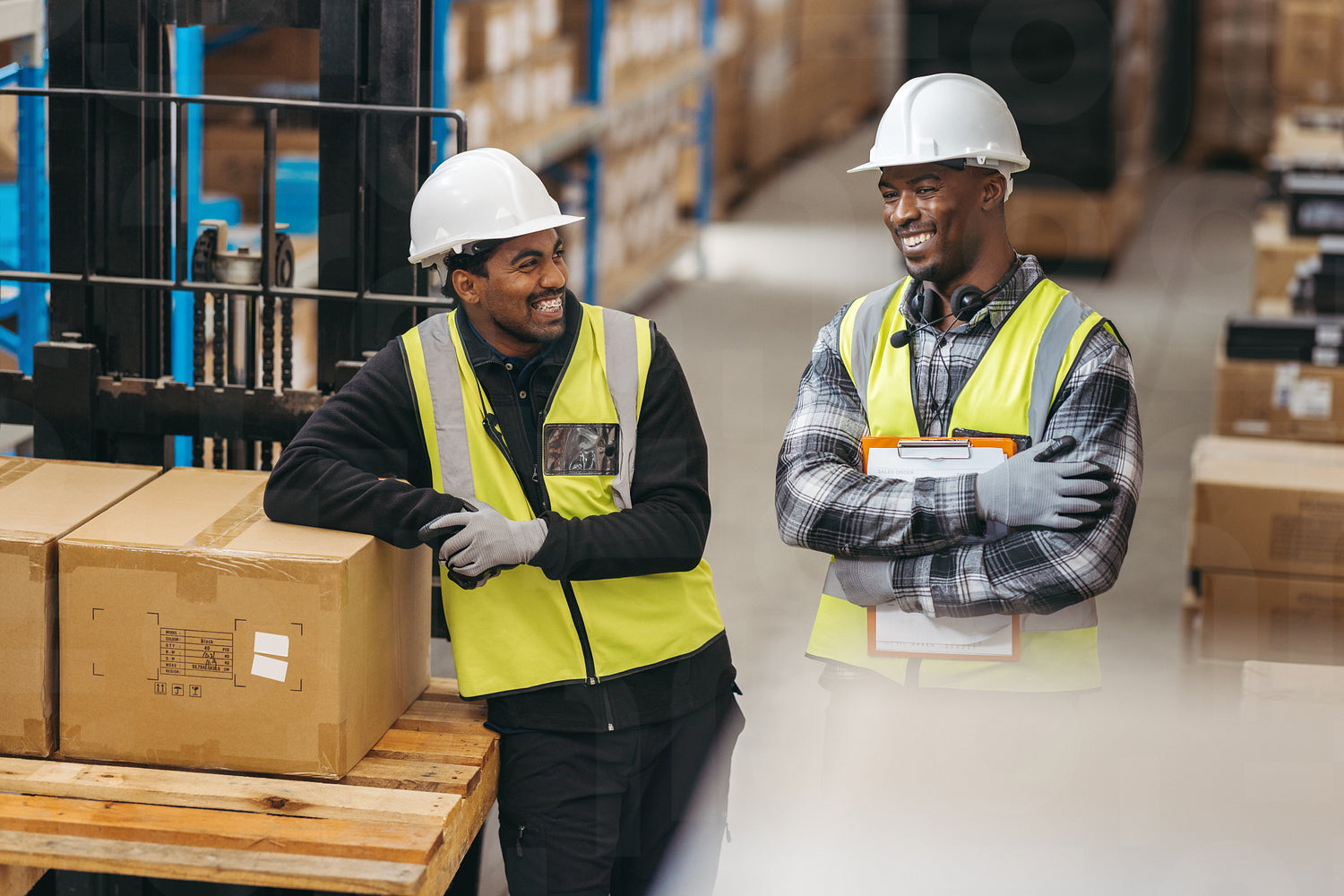 Male warehouse employees laughing together while standing next to a pallet truck in workwear. Two happy young men working together in a large distribution warehouse.