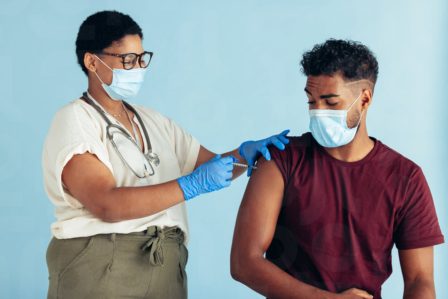 Female doctor wearing face mask and gloves giving vaccine to a man against blue background. Man getting vaccinated by a female doctor.