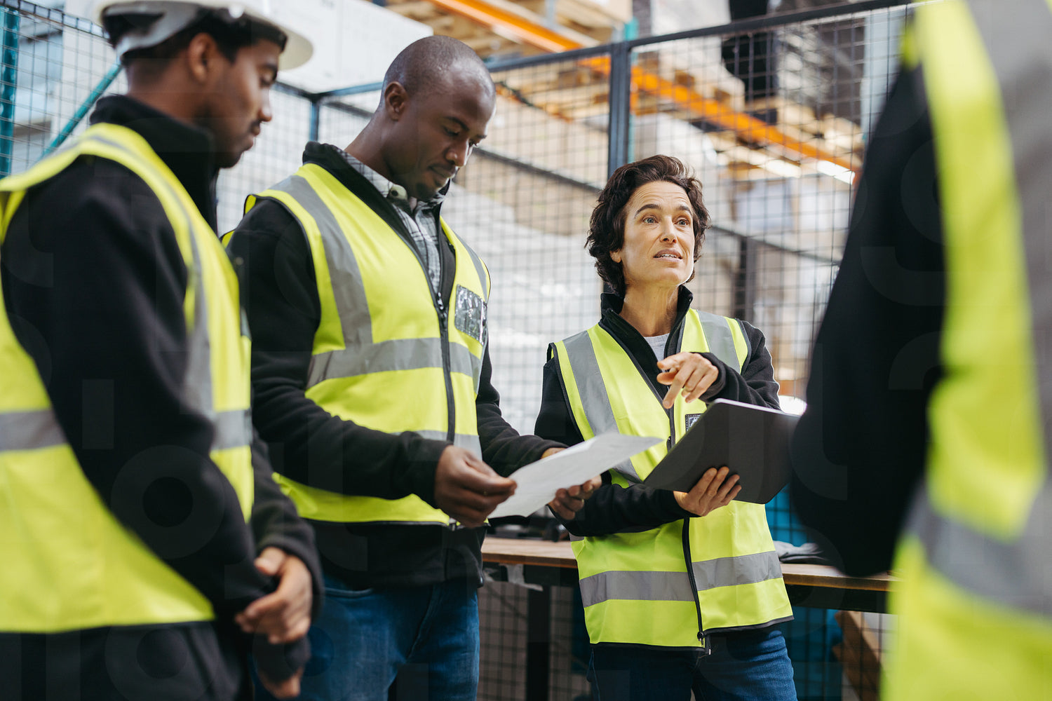 Mature woman having a discussion with her colleagues in a distribution warehouse. Group of multicultural employees having a staff meeting in a logistics centre.