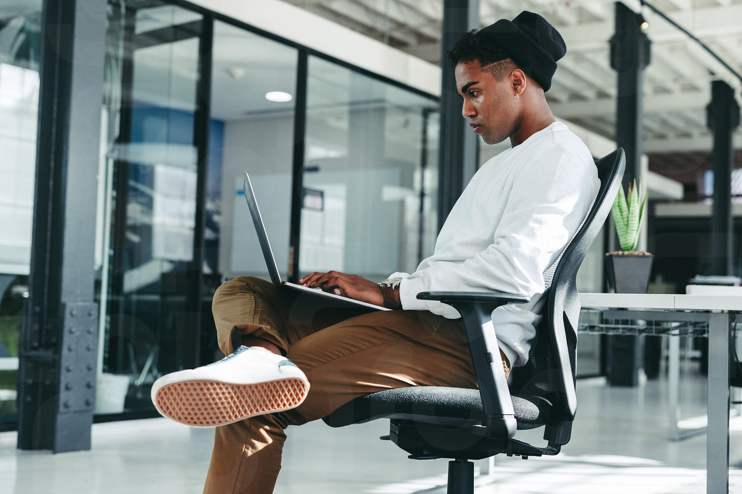 Working on a new code. Focused young software developer using a laptop while working on a new project in an office. Creative businessman sitting alone in a modern workplace.