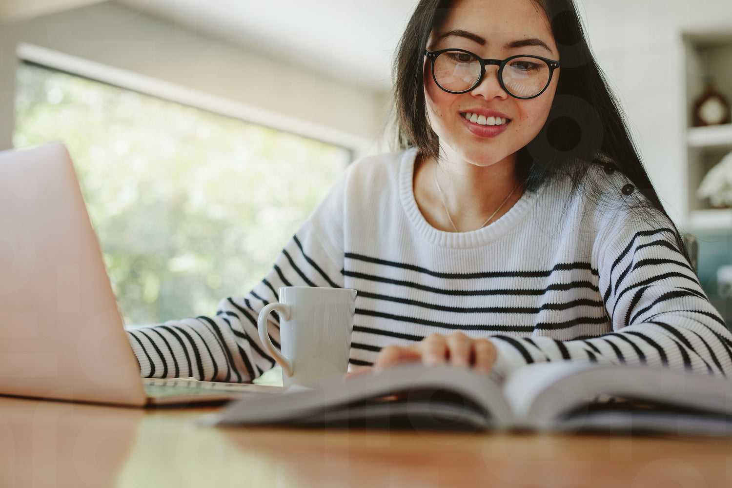 Smiling young woman reading a book with laptop and coffee cup on table. Asian girl wearing eyeglasses studying at home.