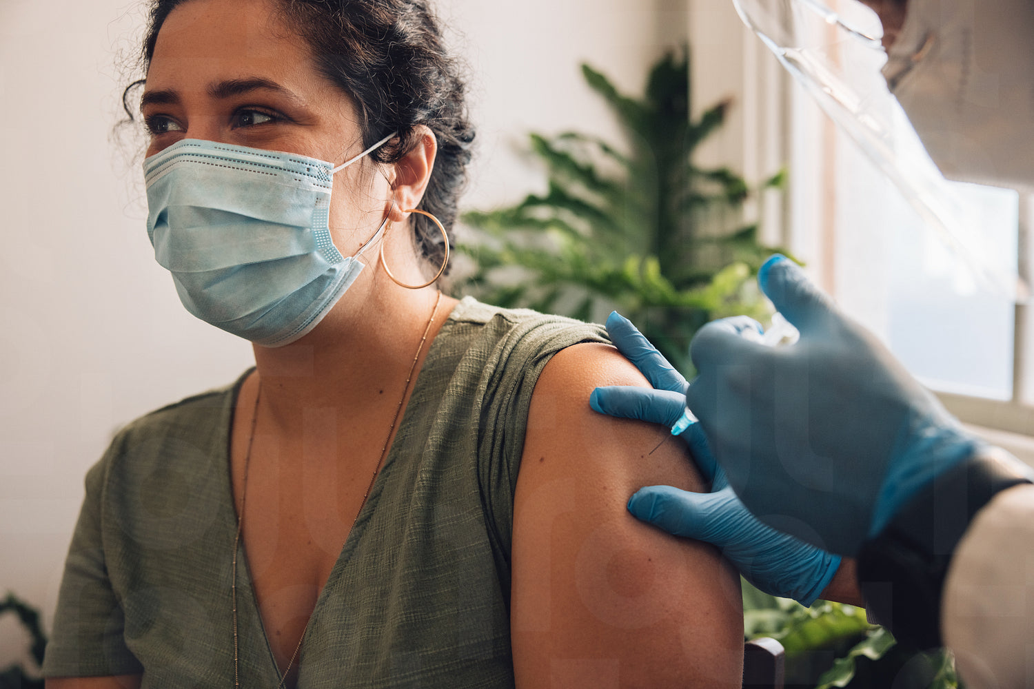 Closeup of a woman wearing face mask getting coronavirus vaccine shot on her arm. Female getting vaccinated by healthcare worker at home.