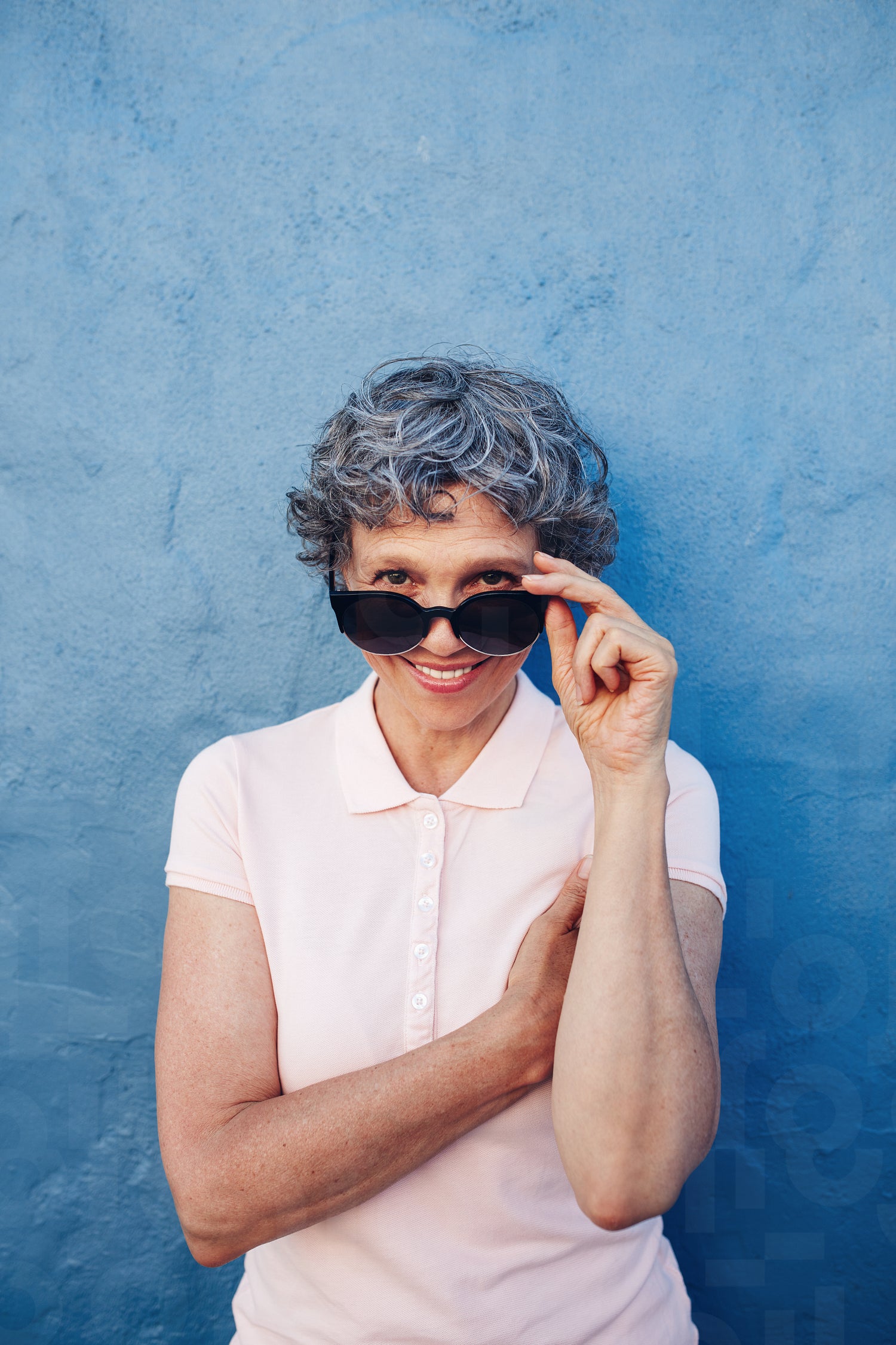 Vertical portrait of attractive senior woman peeking over sunglasses against blue wall. Middle aged female looking at camera and smiling.