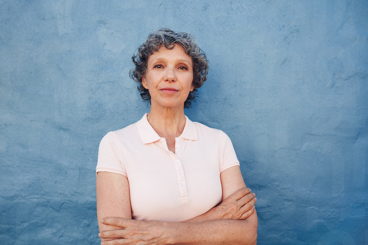 Portrait of confident mature woman standing with her arms crossed against blue background