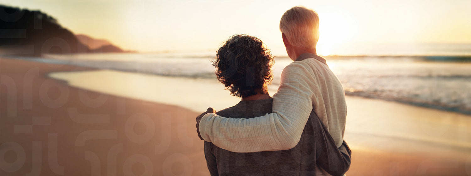 Happy seniors enjoying their golden years of retirement with a beach sunset