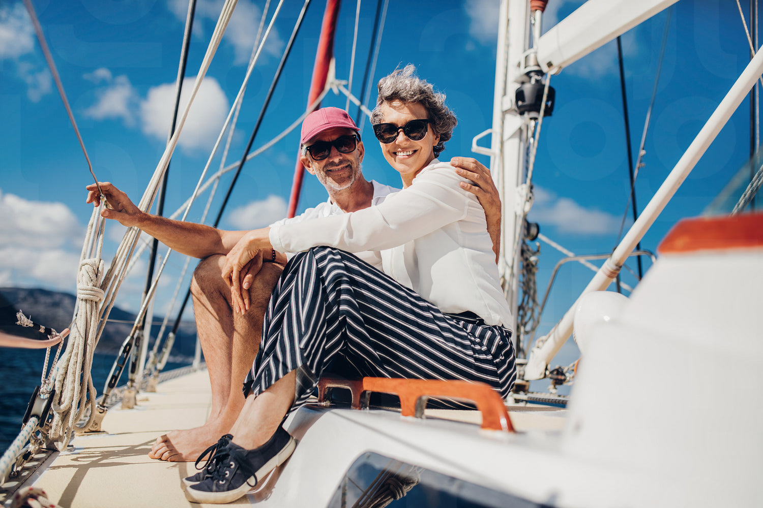 Portrait of happy mature couple sailing the sea on a yacht. Senior couple having great time on yacht. Enjoying summer holidays on a boat.