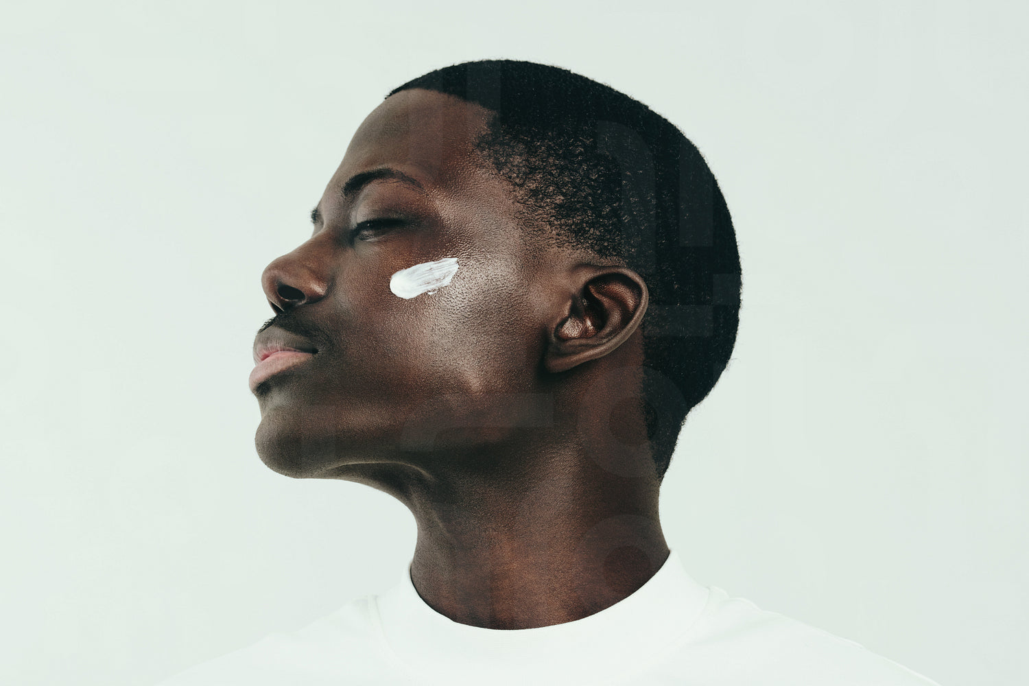 Young black man taking care of his skin, applying some nourishing face cream to keep it moisturized and glowing. With his eyes closed, he savors the refreshing feeling of the cream on his skin, enjoying his daily skincare routine.