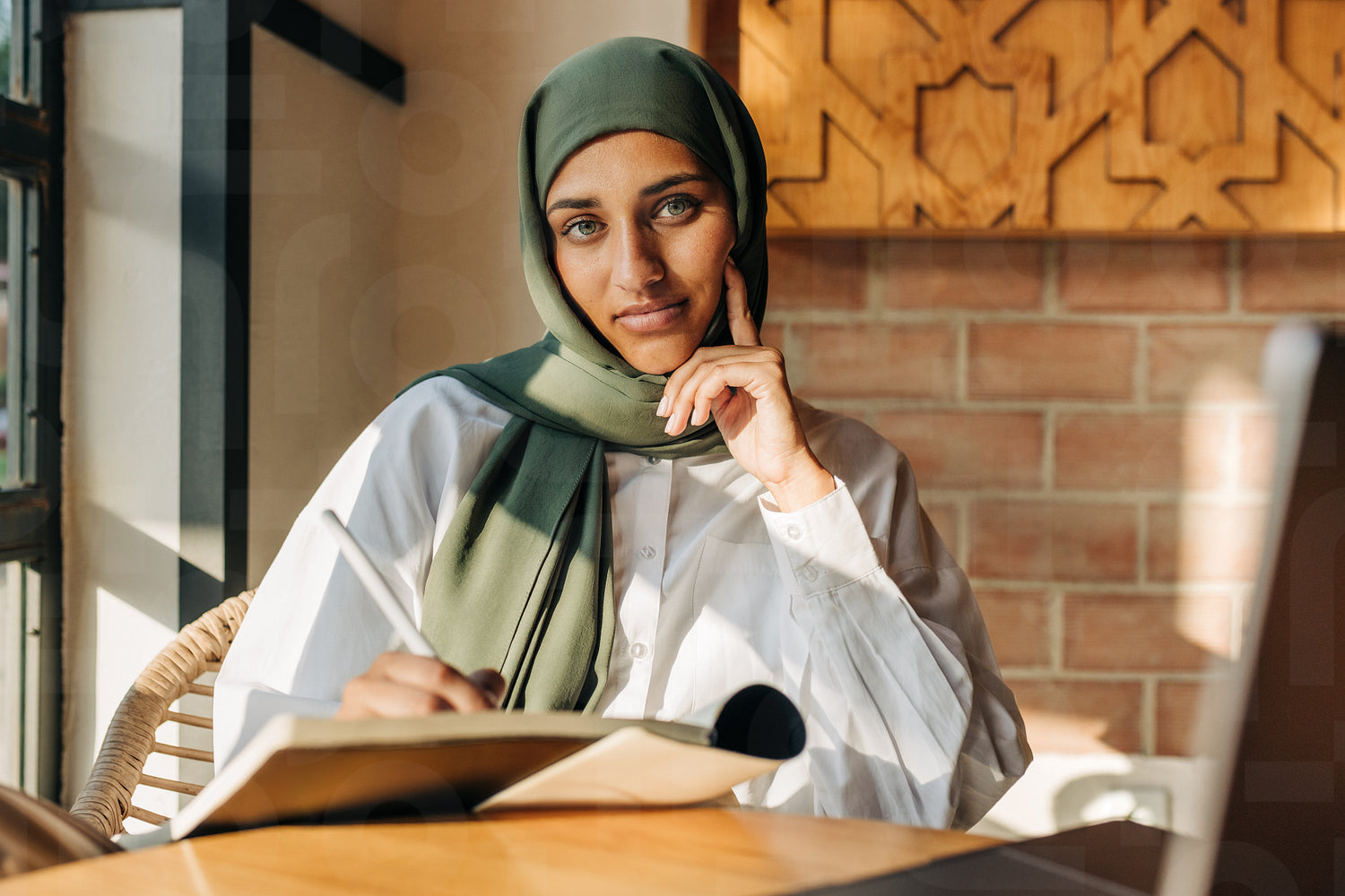 Female university student with a headscarf looking at the camera while writing in a book. Young Muslim woman preparing for an exam while sitting in a campus cafe.