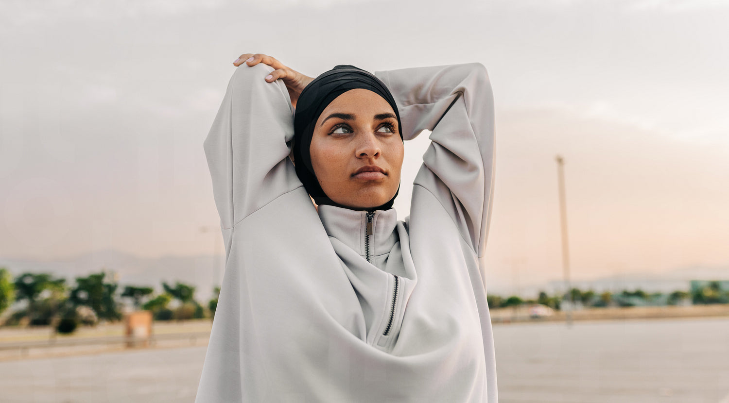 Muslim sportswoman warming up by doing stretch exercises outdoors in the morning. Athletic woman with a hijab having a workout session in the city.