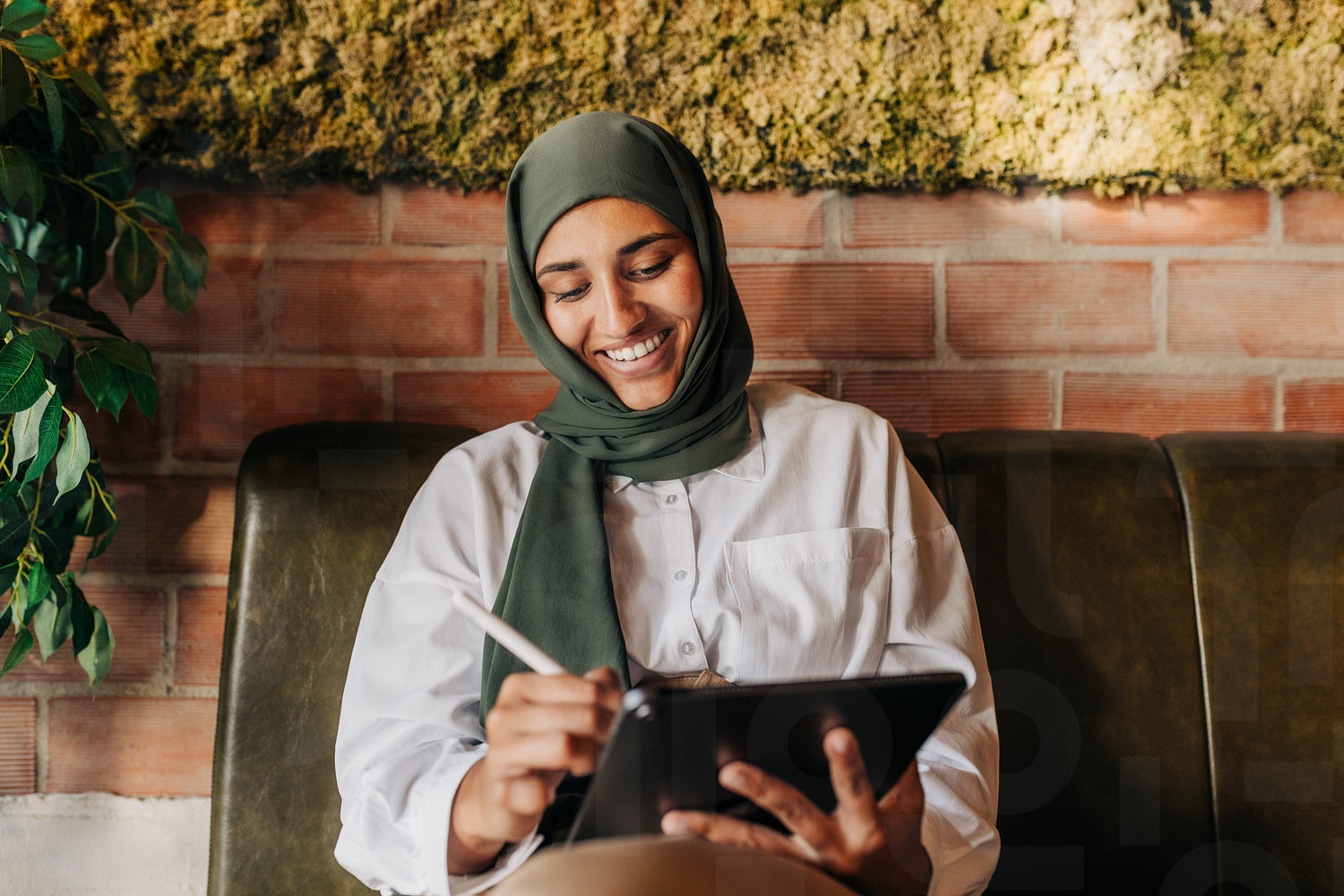 Designer with a hijab smiling happily while drawing on a digital tablet in a cafe. Cheerful young Muslim woman working on a new graphic design project while sitting on a couch.