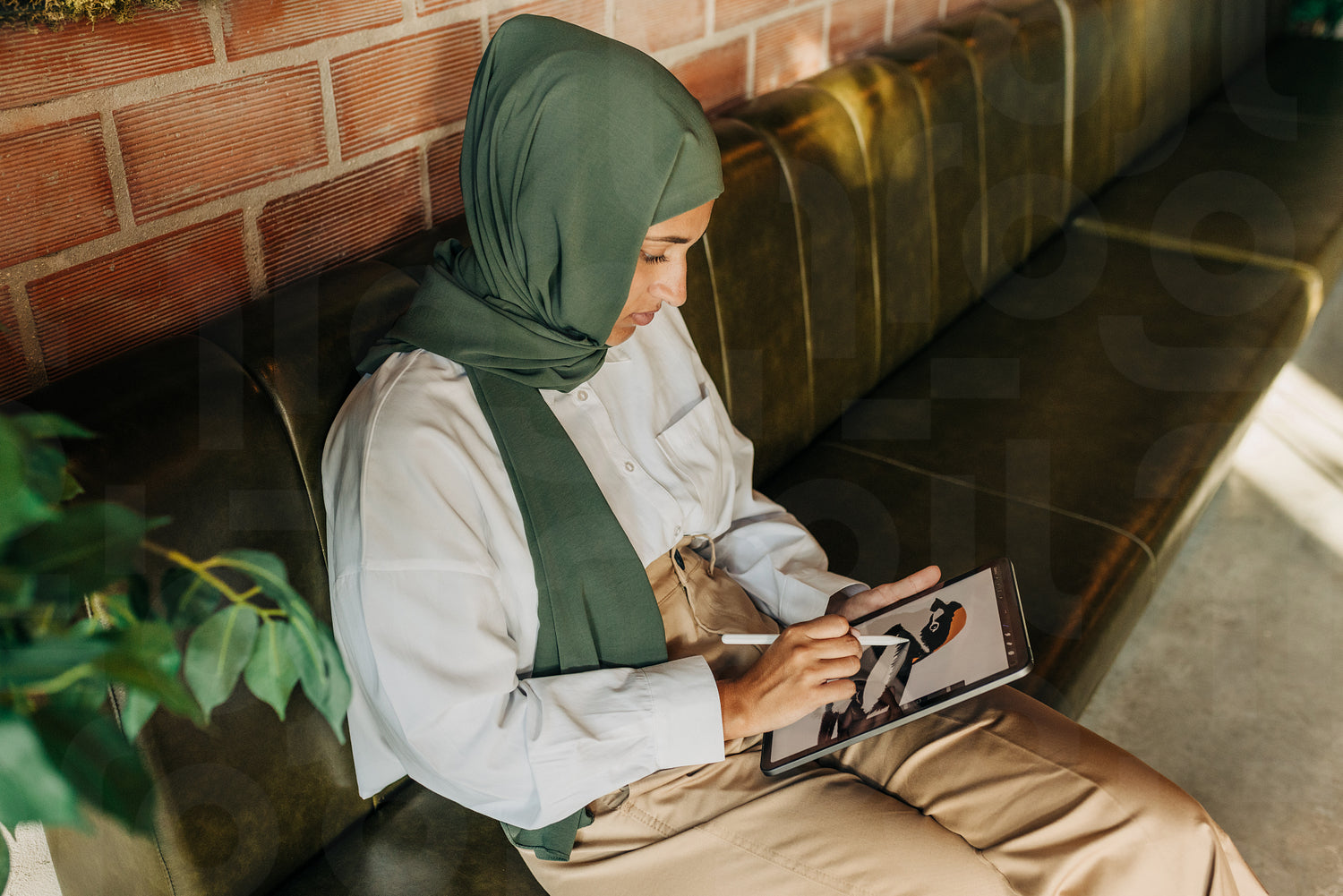 Muslim graphic designer drawing a creative image on a digital tablet in a cafe. Young woman with a hijab working on a new freelance project while sitting on a couch.