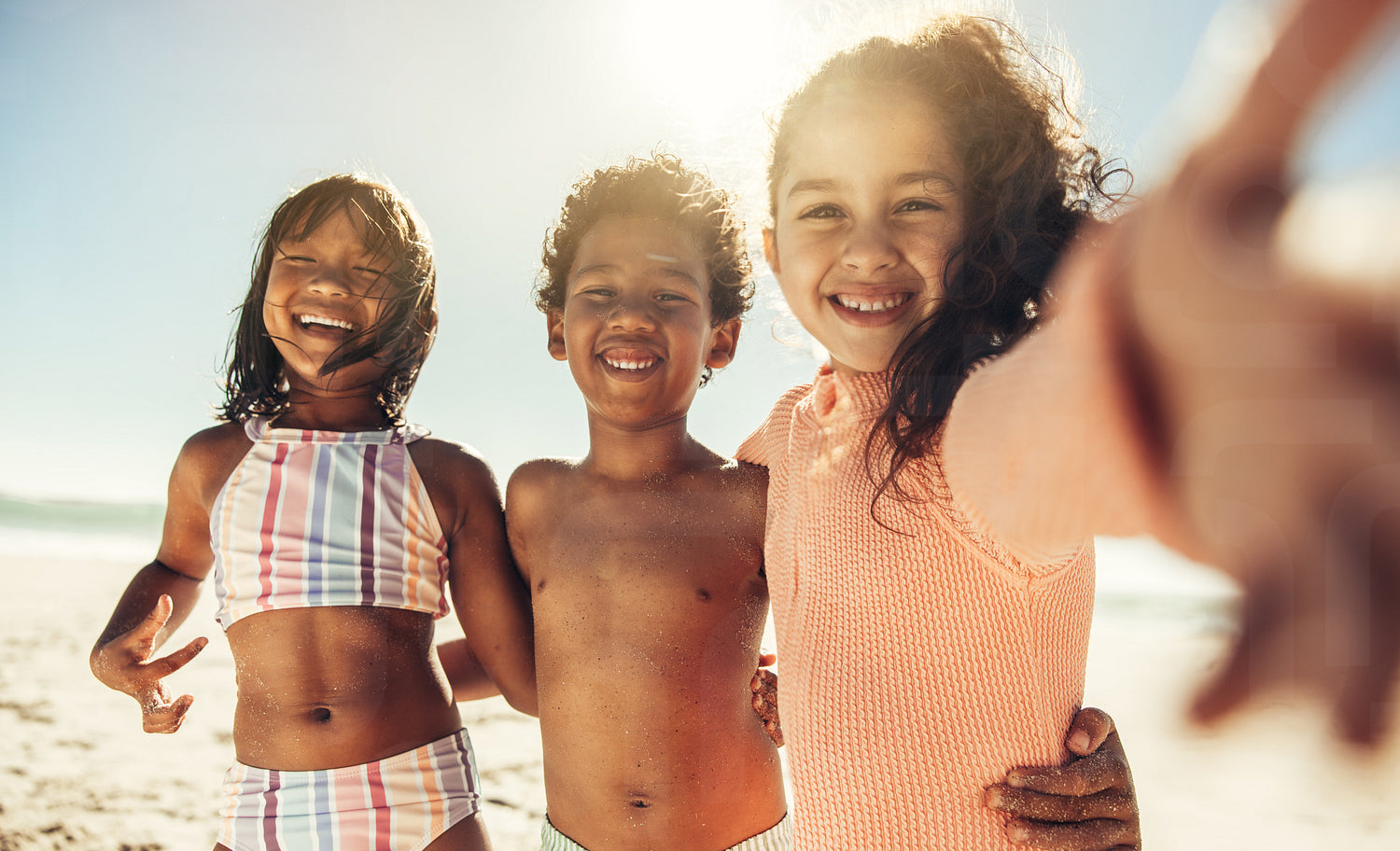 Happy children taking a selfie together at the beach