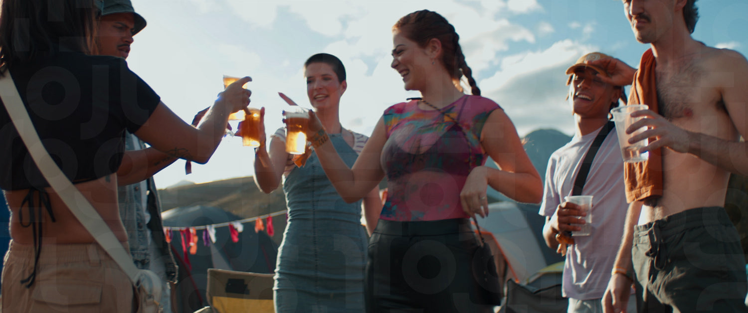 A group of happy friends cheer their beers together at an outdoor festival. Captured using an anamorphic lens and presented in the 2.39:1 CinemaScope aspect ratio.