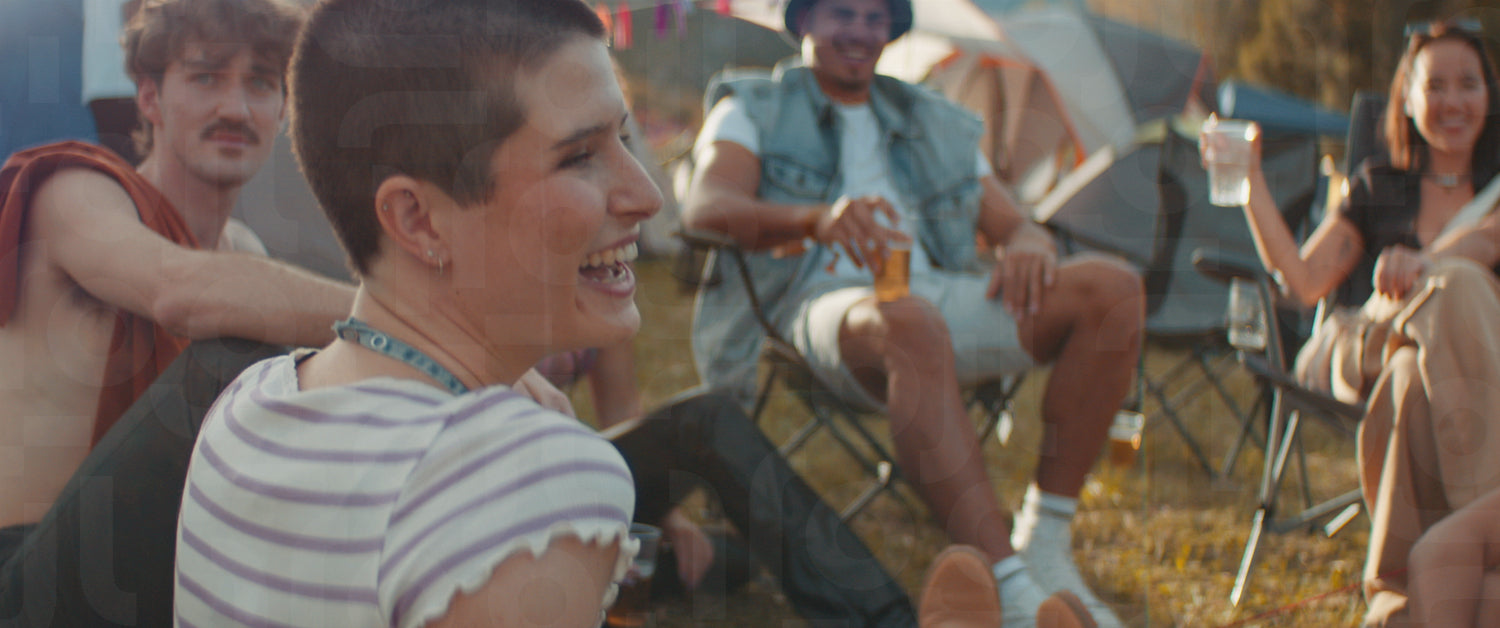 Group of young people sit together at an outdoor music festival campsite, drinking and laughing. Captured using an anamorphic lens and presented in the 2.39:1 CinemaScope aspect ratio.