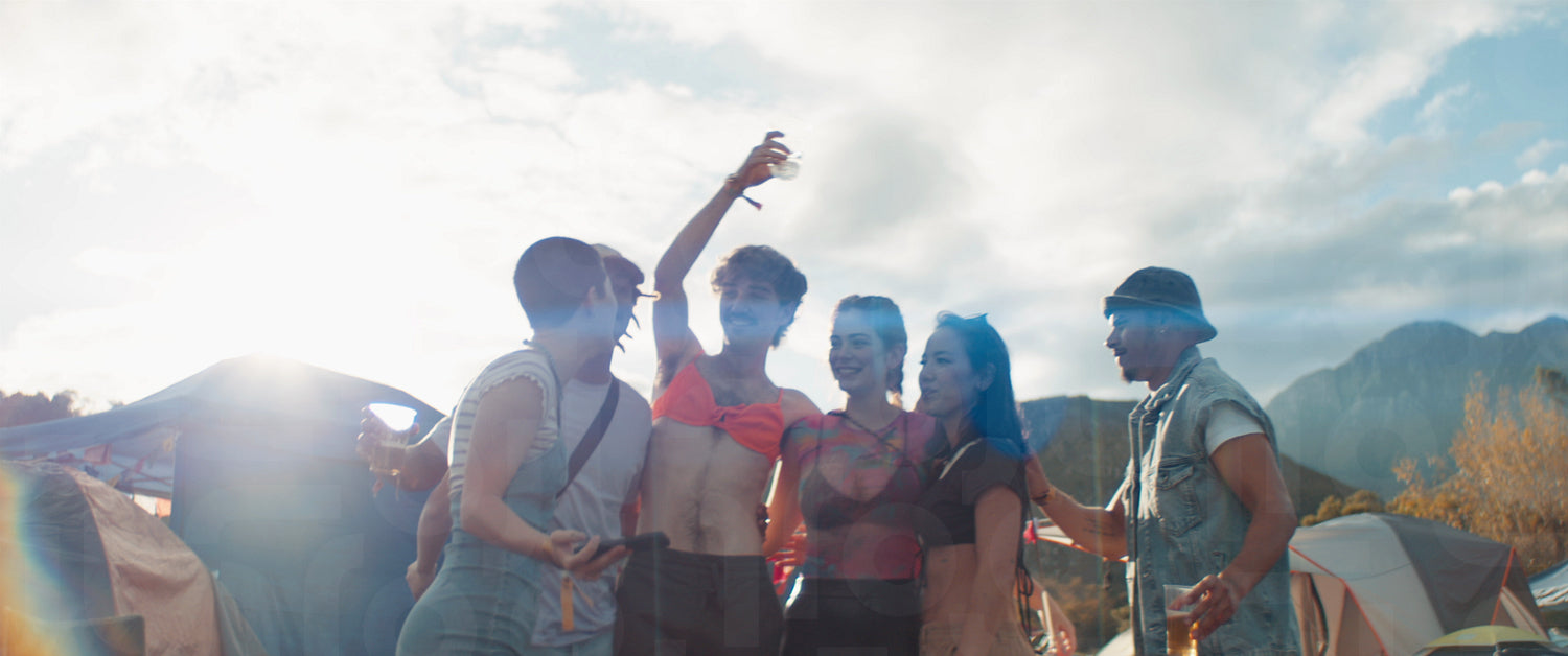 Group of friends enjoy themselves while taking a selfie at an outdoor festival at sunset. Captured using an anamorphic lens and presented in the 2.39:1 CinemaScope aspect ratio.