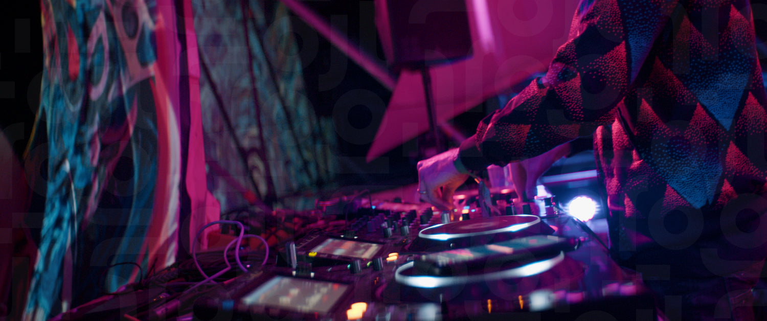 A DJ mixing music at a music festival with colorful lights. Captured using an anamorphic lens and presented in the 2.39:1 CinemaScope aspect ratio.