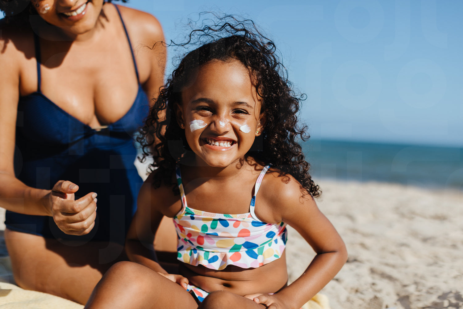 A cheerful girl with sunscreen on her face enjoying a sunny summer day at the beach. The perfect moment of fun and sun protection.