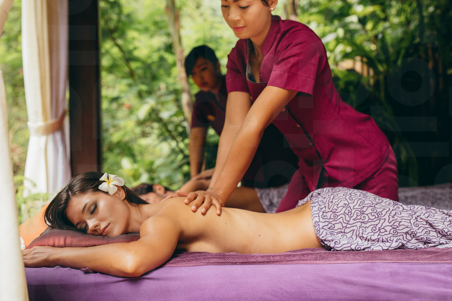 Shot of female massage therapist massaging caucasian woman at outdoor spa. Couple having body massage at luxury resort spa center.