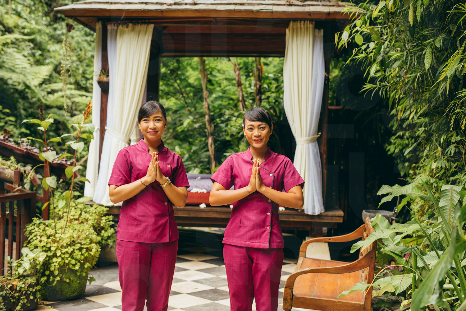 Outdoor shot of two female massage therapist welcoming guest at beauty spa, with their hands joined for greetings. Professional masseuse.