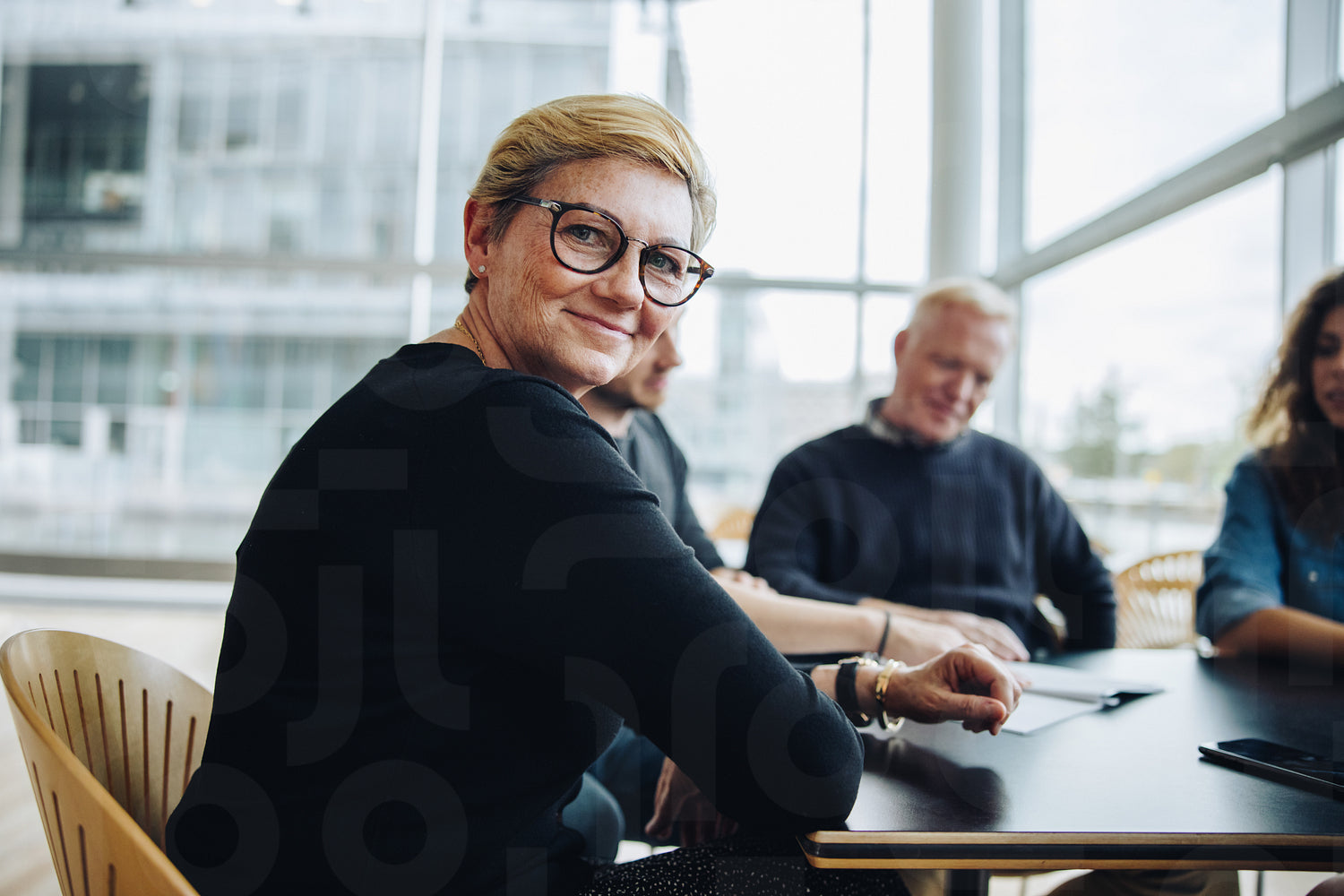 Happy businesswoman sitting at a business meeting with colleagues in background. Mature woman with team in conference room attending a meeting.
