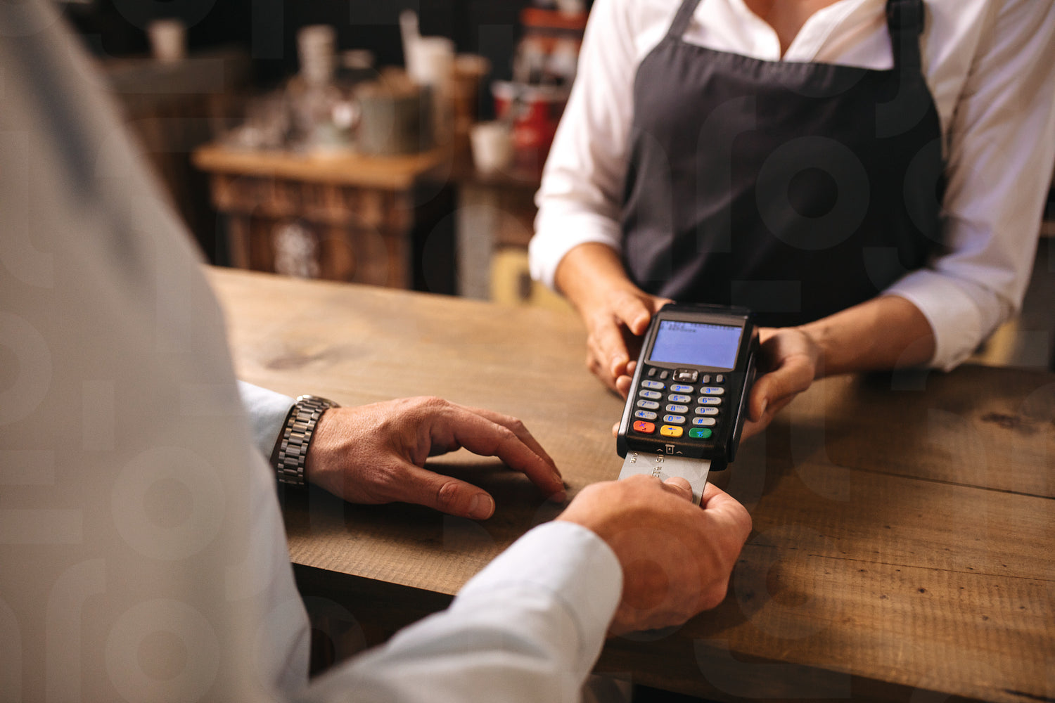 Cropped shot of male customer paying for coffee by credit card at cafe. Woman barista holding a credit card reader machine with man doing payment on cafe counter.