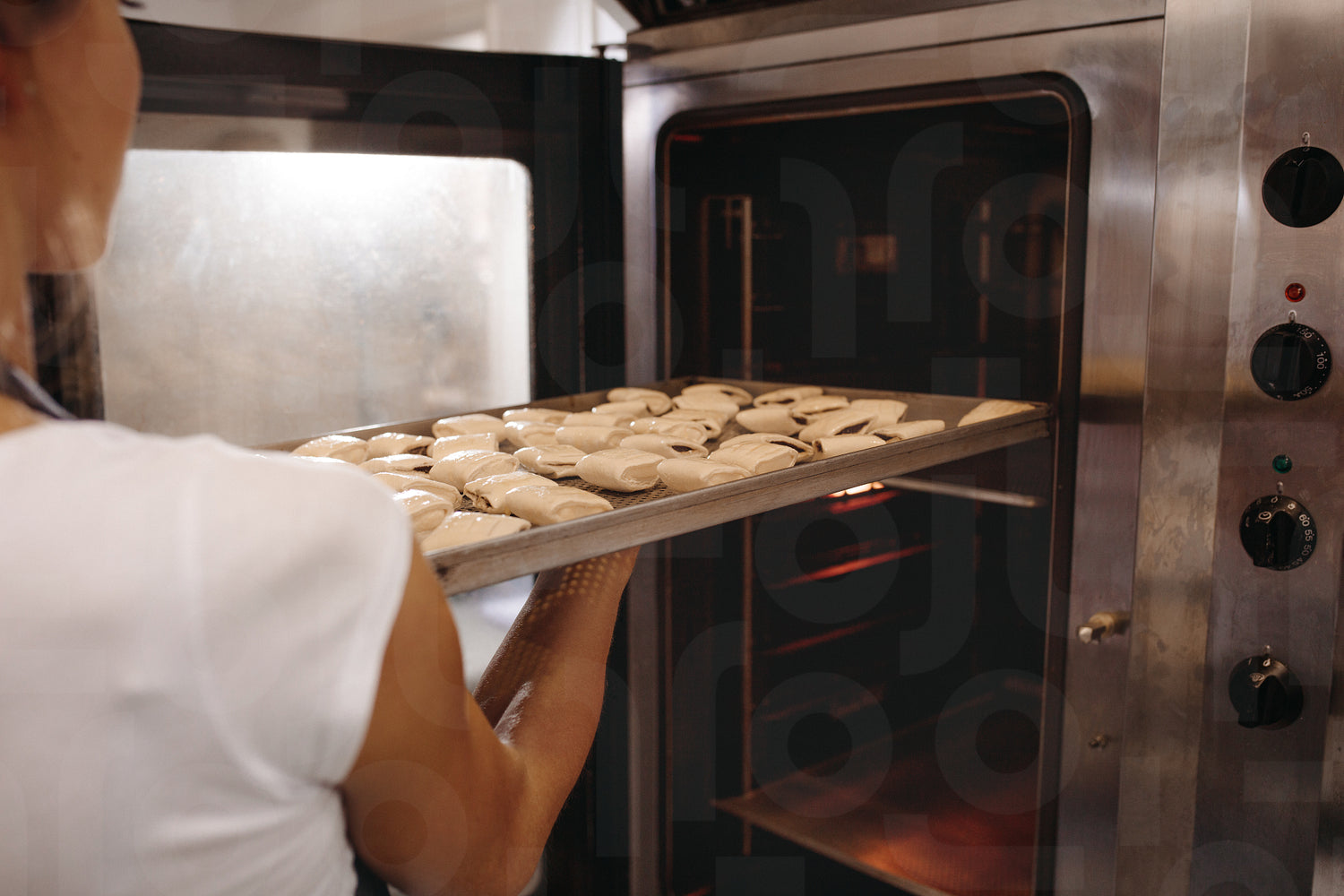 Female baker putting a baking tray full of rolls in oven. Woman baking rolls in a bakery.