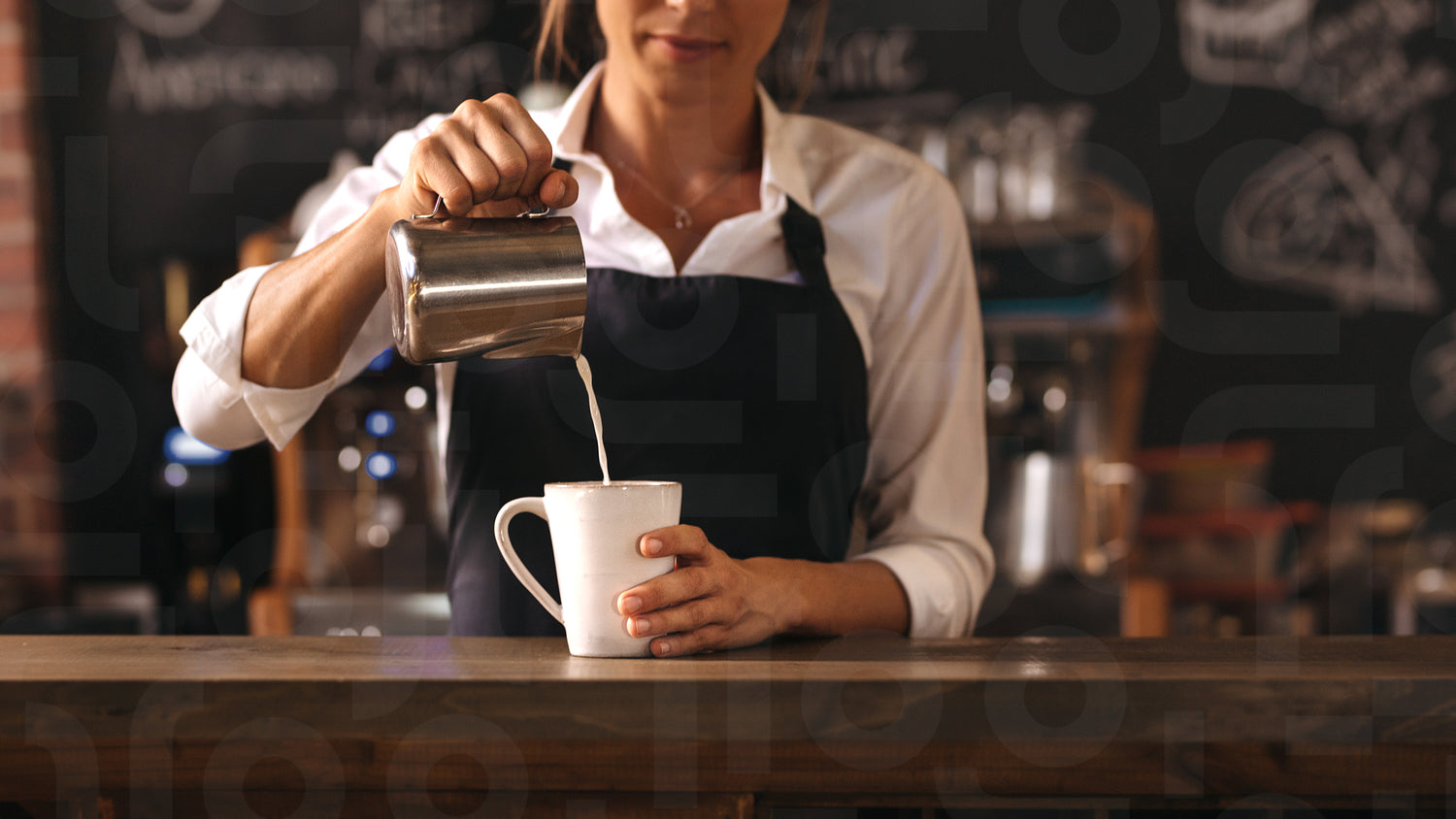 Cropped shot of female barista making a cup of coffee while standing behind cafe counter. Young woman pouring milk into a cup of coffee.