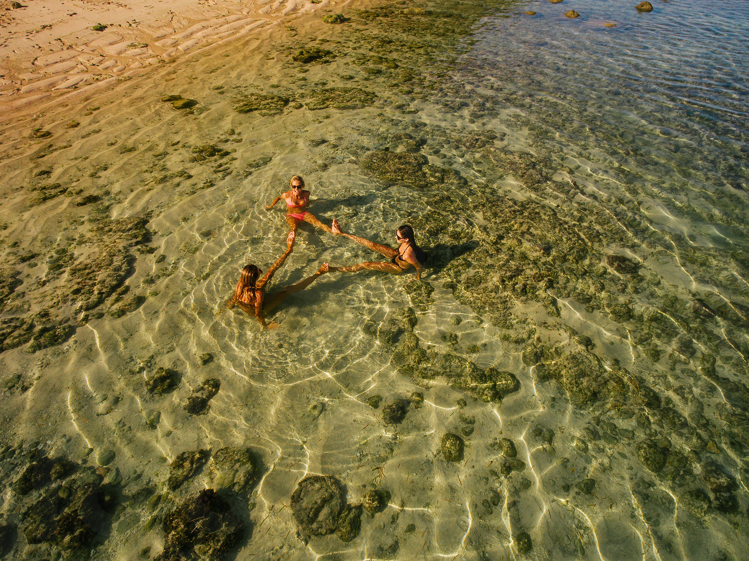 Aerial view of three young women sitting in sea water with their feet touching and making a formation. Female friends relaxing in sea.