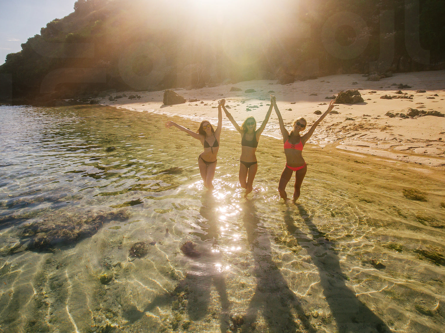 Shot of young female friends on the beach with their hands raised. Three women having fun on beach vacation on a summer day.
