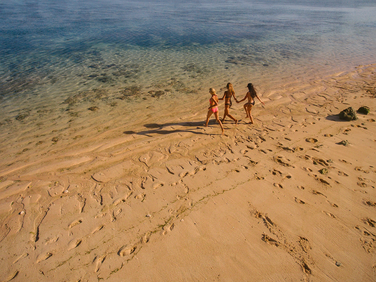 Rear view shot of three young women running into the sea for a swim. Aerial view of young female friends having fun on beach vacation.