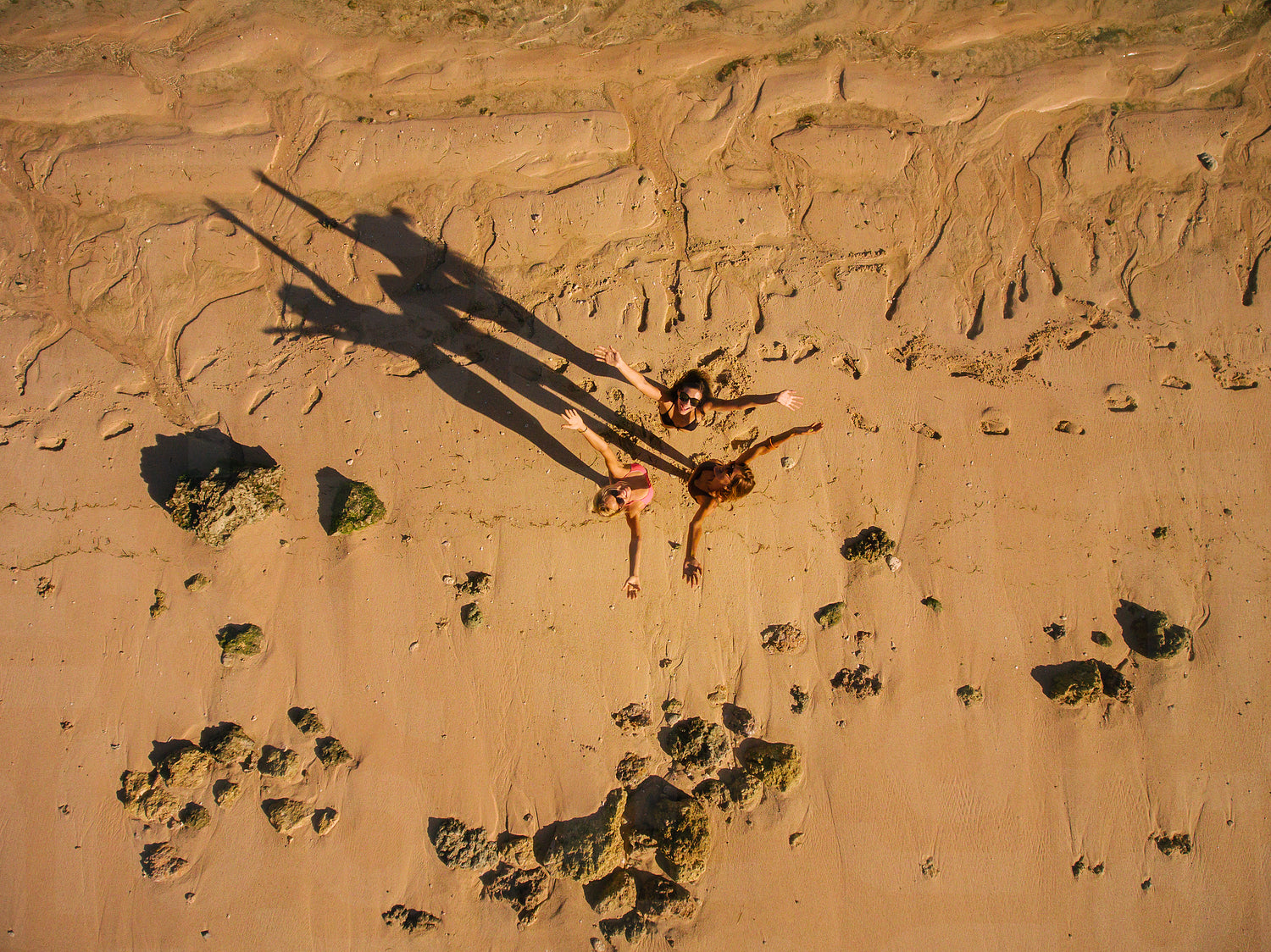 Aerial view of three young female friends standing on the beach with their hands raised. Women having fun on beach vacation.