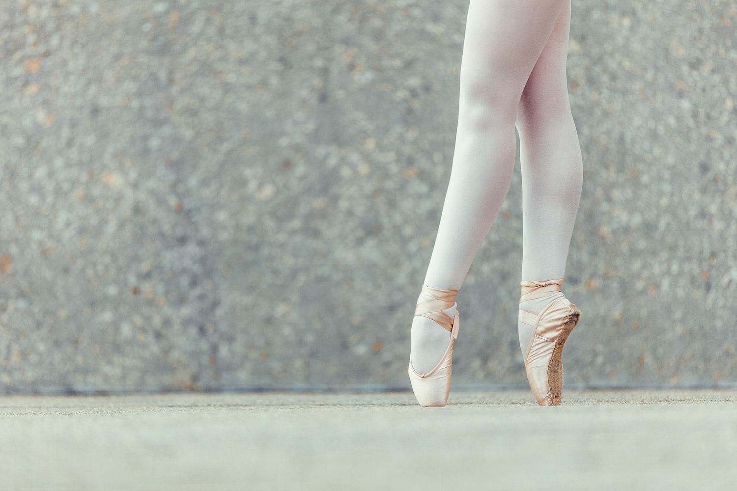 Closeup shot of legs of a female ballet dancer standing on her toes wearing pointe shoes. Ballet dancer practicing dance moves.