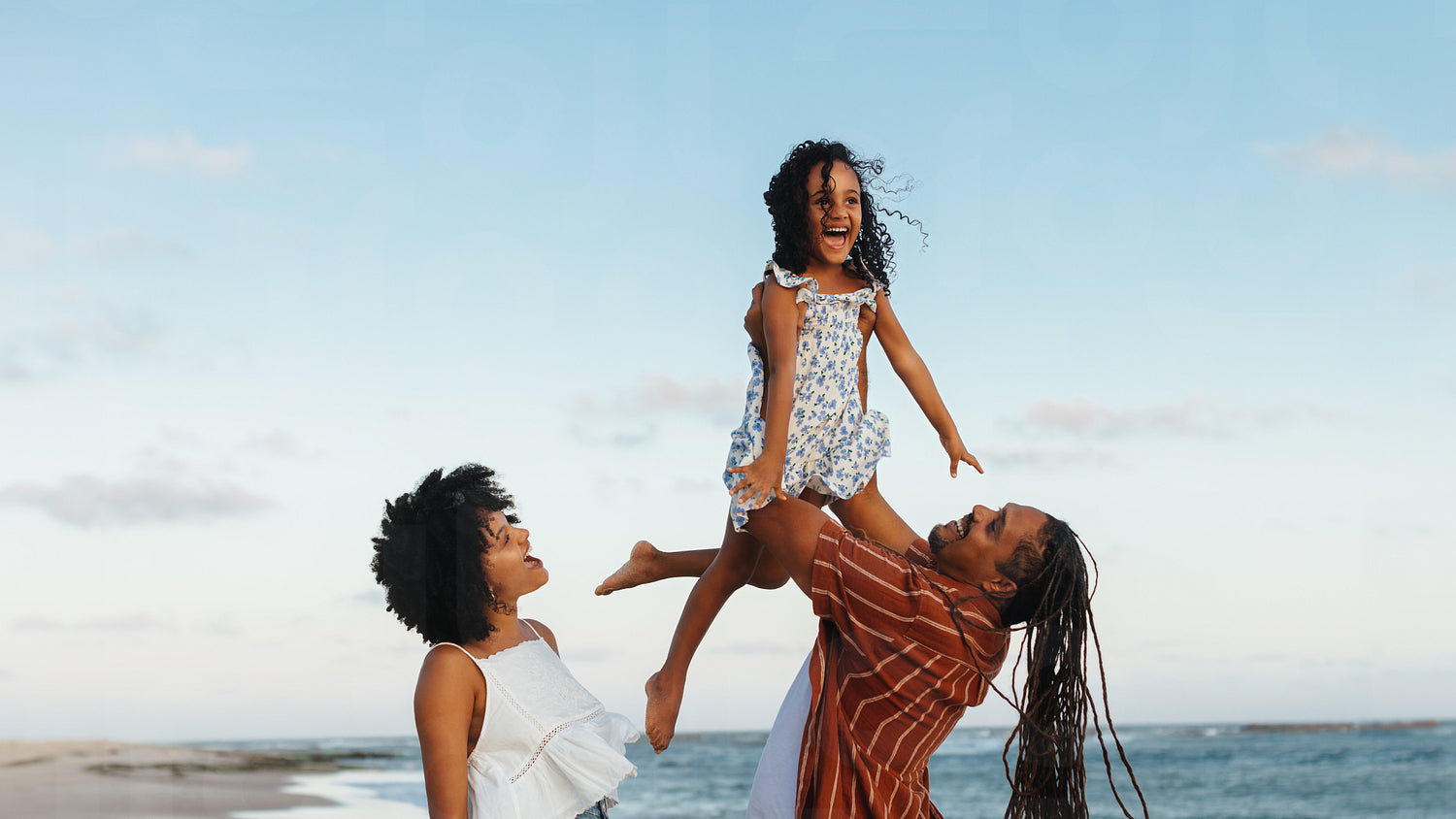 Happy family at the beach on vacation, with parents playing and lifting their child in the air. Joyful and carefree moments.