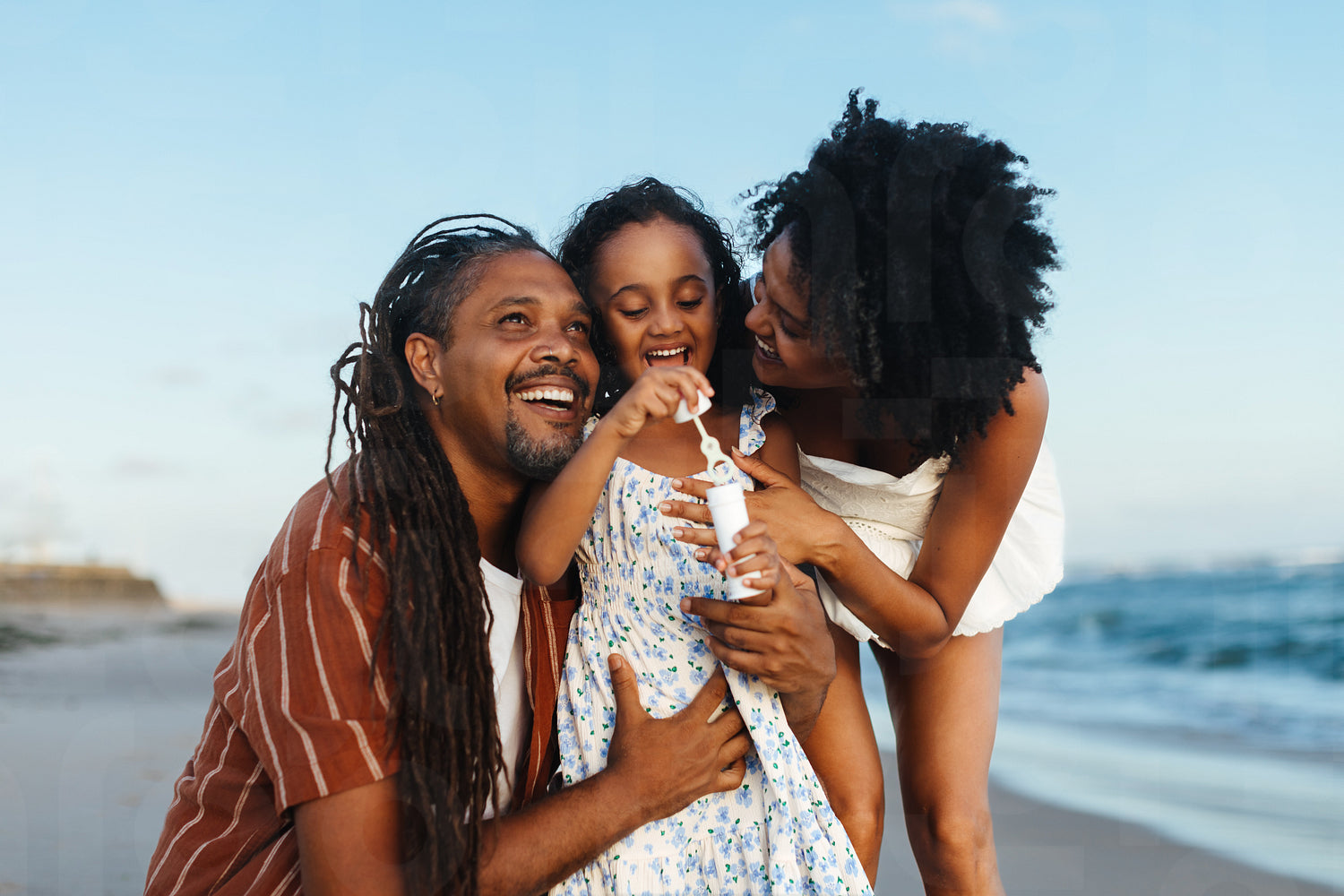 Happy family moment at the beach with mother, father, and daughter blowing bubbles