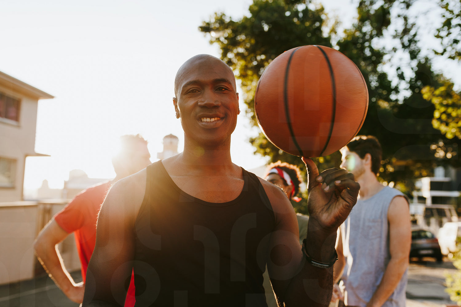 Four basketball men walking down the street after a game of basketball. Man spinning basketball on his thumb.
