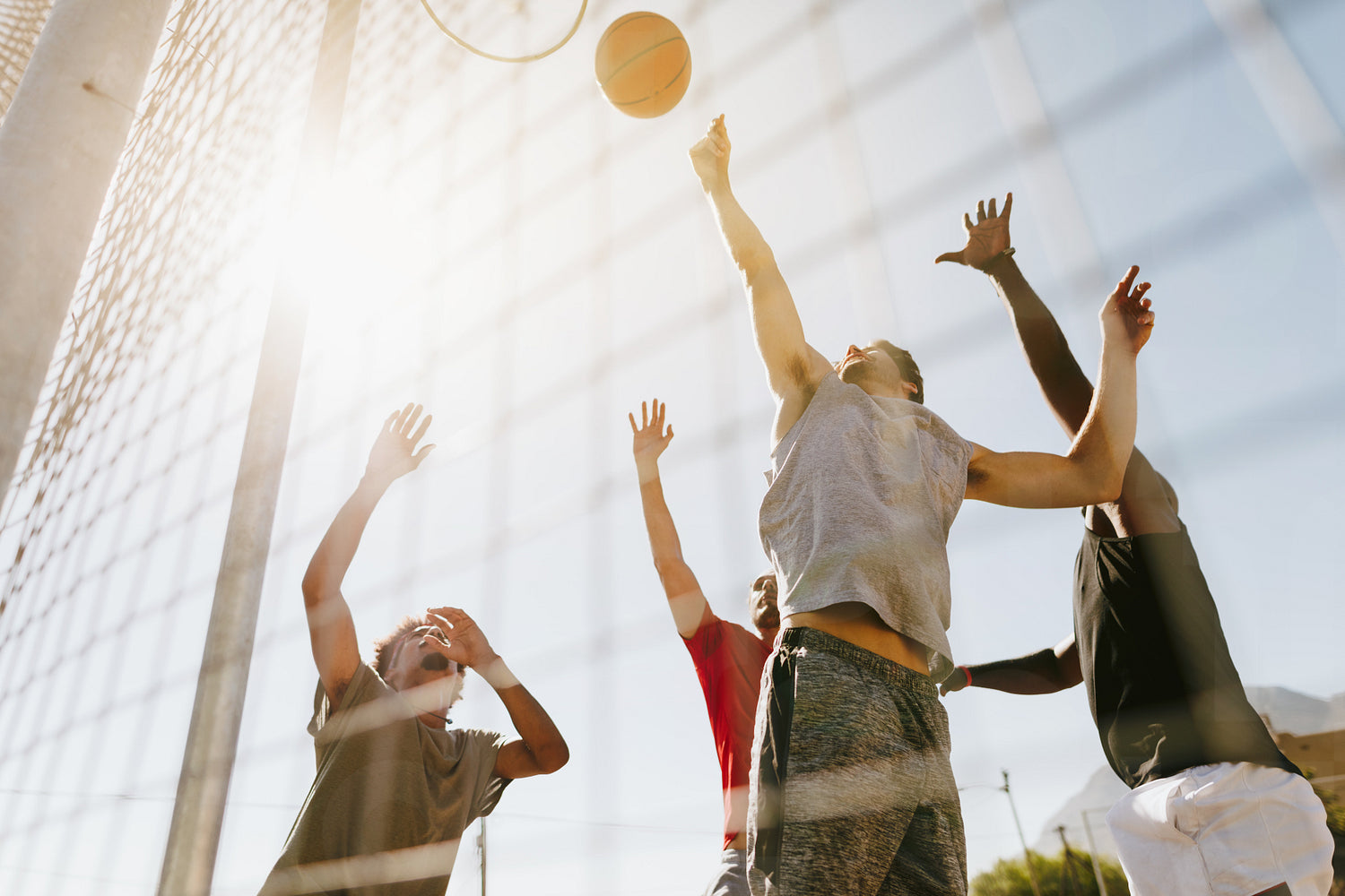 Four men playing basketball in a basketball court on a sunny day. Men jumping high to reach for the ball near the basket.