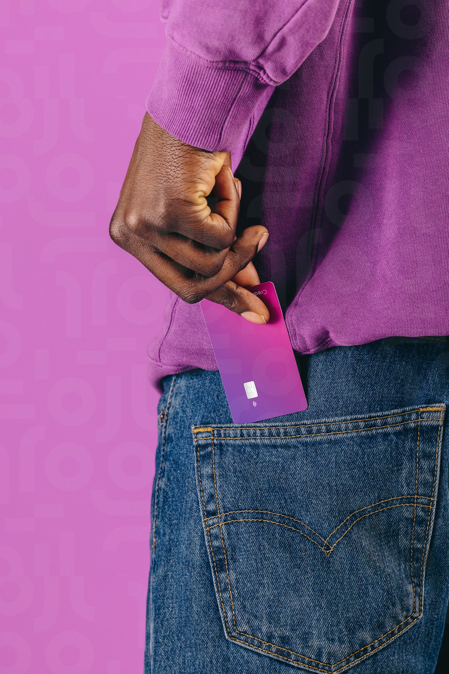 Young man putting his purple credit card into his jeans pocket in a studio. Young male fits electronic banking into his lifestyle as he explores electronic and contactless payments methods.