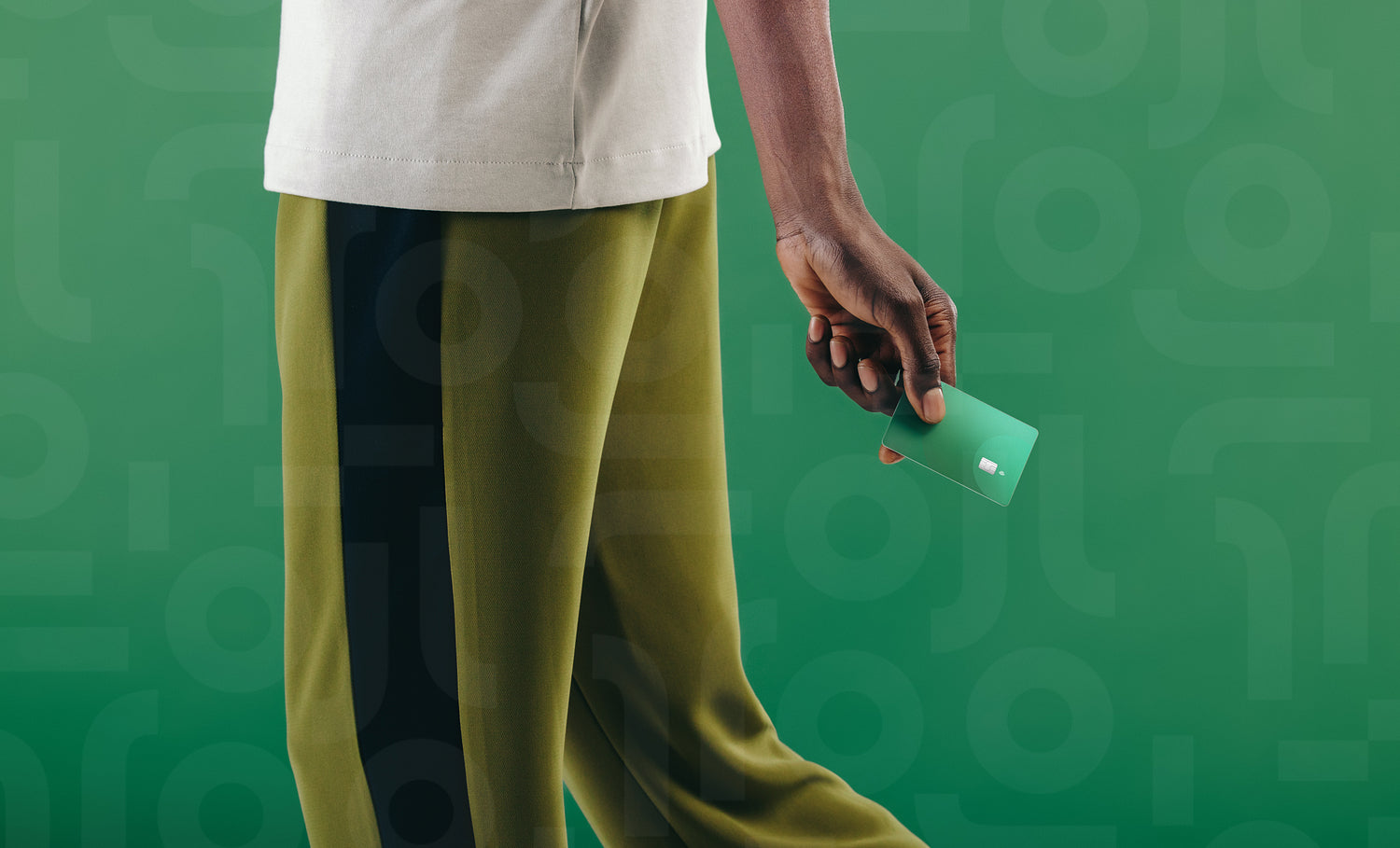 Young man walks with his contactless credit card in his hand in a studio. Modern male consumer making use of electronic banking and cashless payment methods.