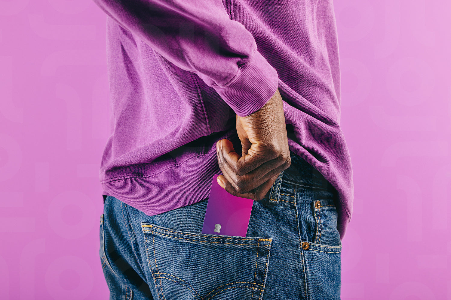 Rearview of a young man pulling a credit card out of his jean pockets in a studio. Male credit card holder using electronic payment methods in his banking lifestyle.