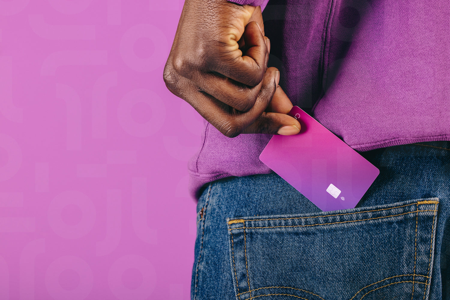 Paying with plastic: Man pulls a purple credit card from his pocket in a studio