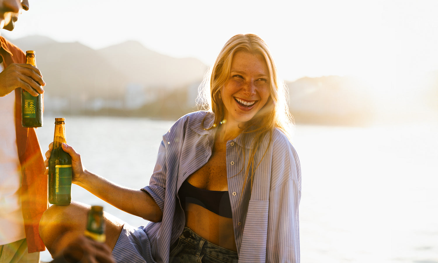A joyful scene of friends sharing drinks by the water at sunset, capturing the essence of summertime. The focus is on a smiling woman with blonde hair, surrounded by the warm glow of the setting sun.