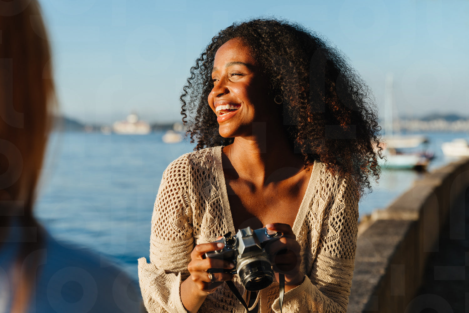 A joyful young woman is captured holding a camera at the scenic Mureta Da Urca. The sunlit atmosphere highlights her happiness as she enjoys a day by the waterfront.
