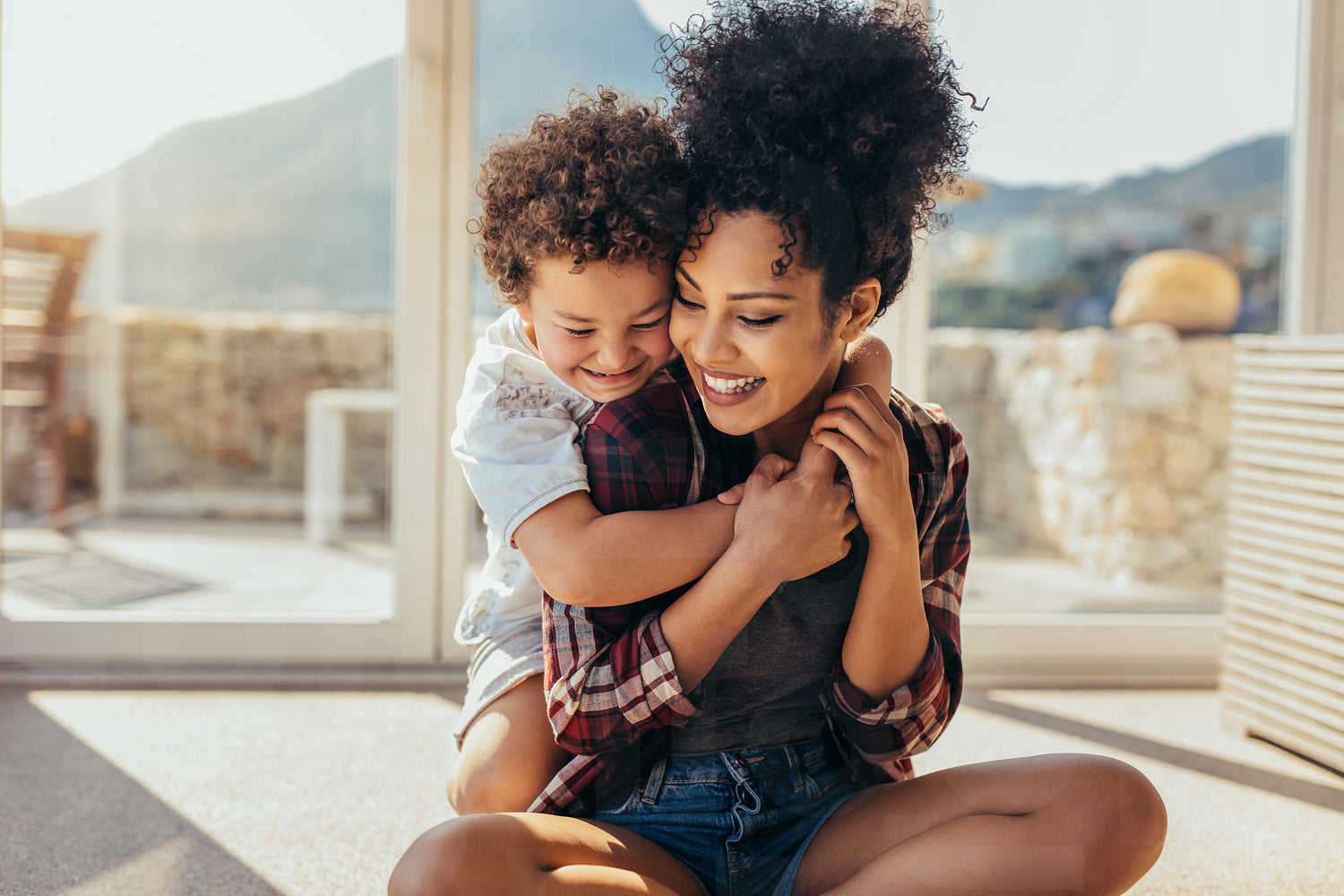 Kid holding his mother from behind and smiling. Woman sitting on floor playing with her child at home on a sunny day.