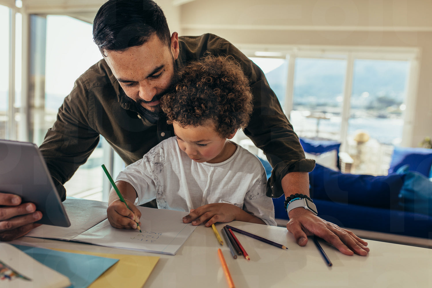 Man holding a digital tablet helping his child in doing his school work. Boy sitting at the table and writing while his father is looking at it from behind.