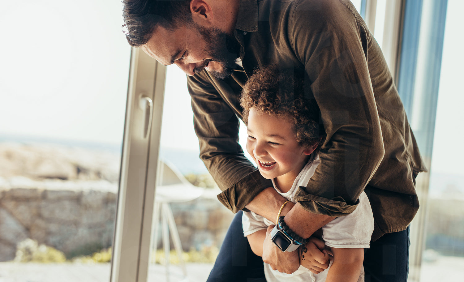 Father pampering his child holding him from behind. Father and son having fun playing at a beach house.